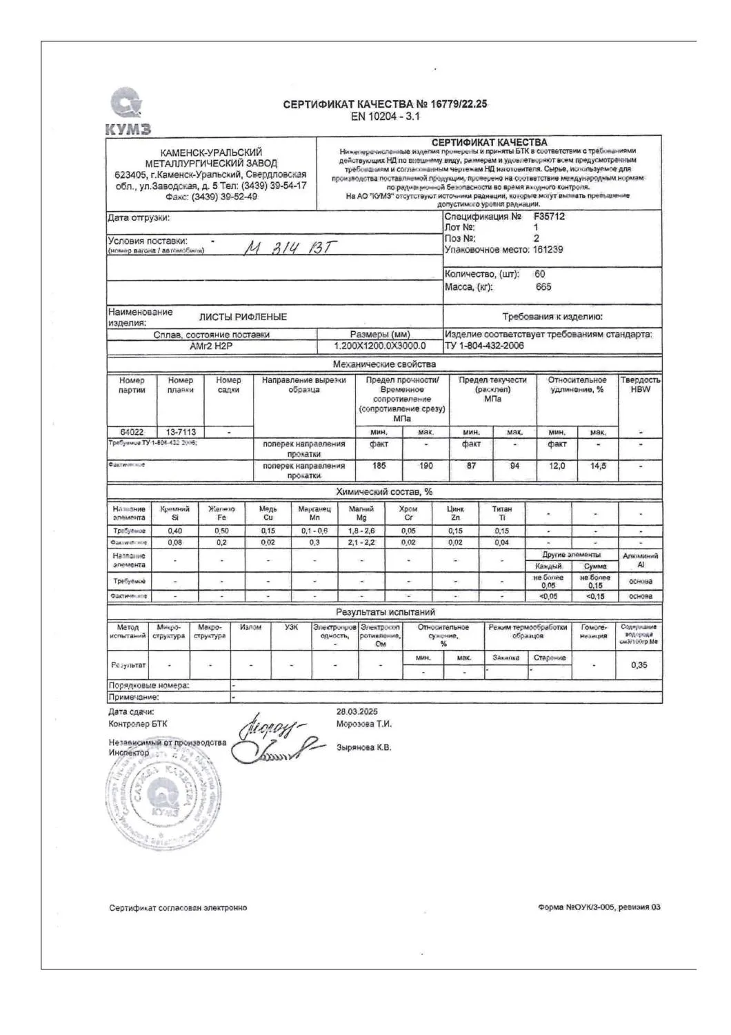 Сертификат качества для листов алюминиевых рифленых. Продукция сплава АМг2 Н2Р. Изделие соответствует ТУ 1-804-432 2006.