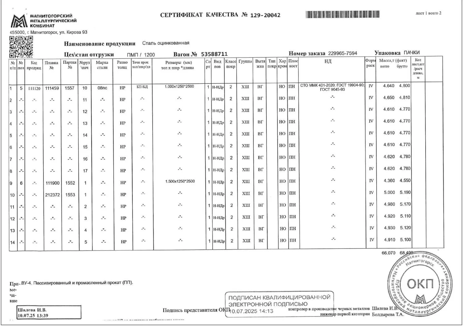 Сертификат качества для оцинкованных листов из стали 08пс. Продукция соответствует ГОСТ 19904-90, ГОСТ 9045-93.