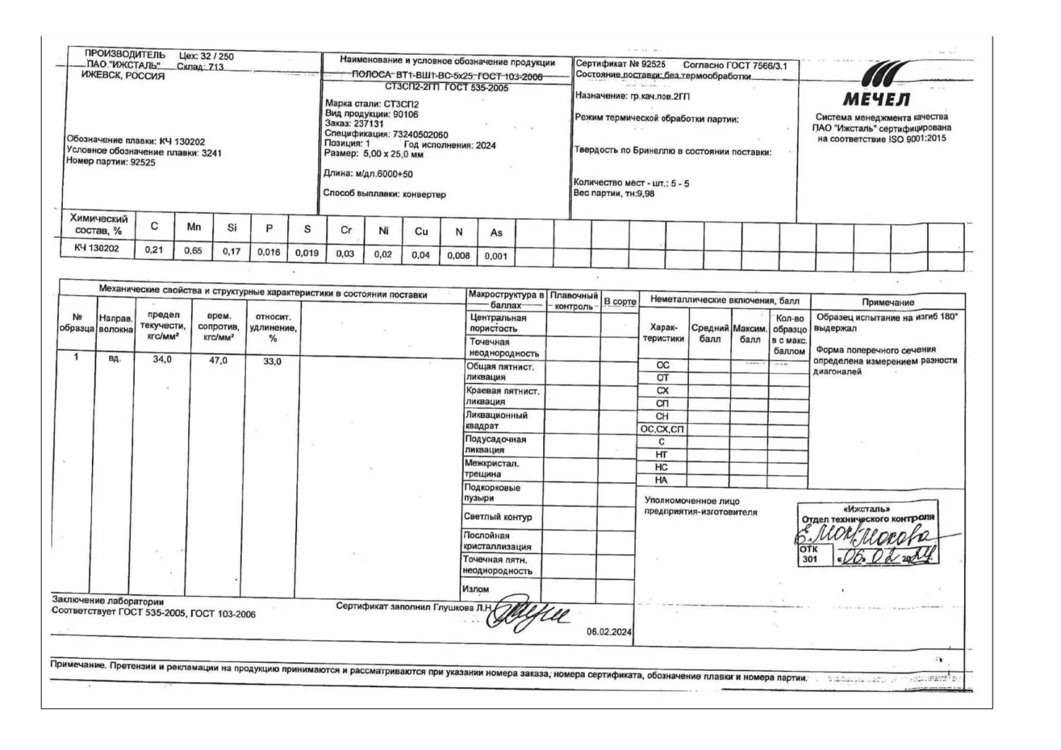 Сертификат качества для стальных полос. Продукция сплава СТ3СП2. Изделие соответствует ГОСТ 103-2006.