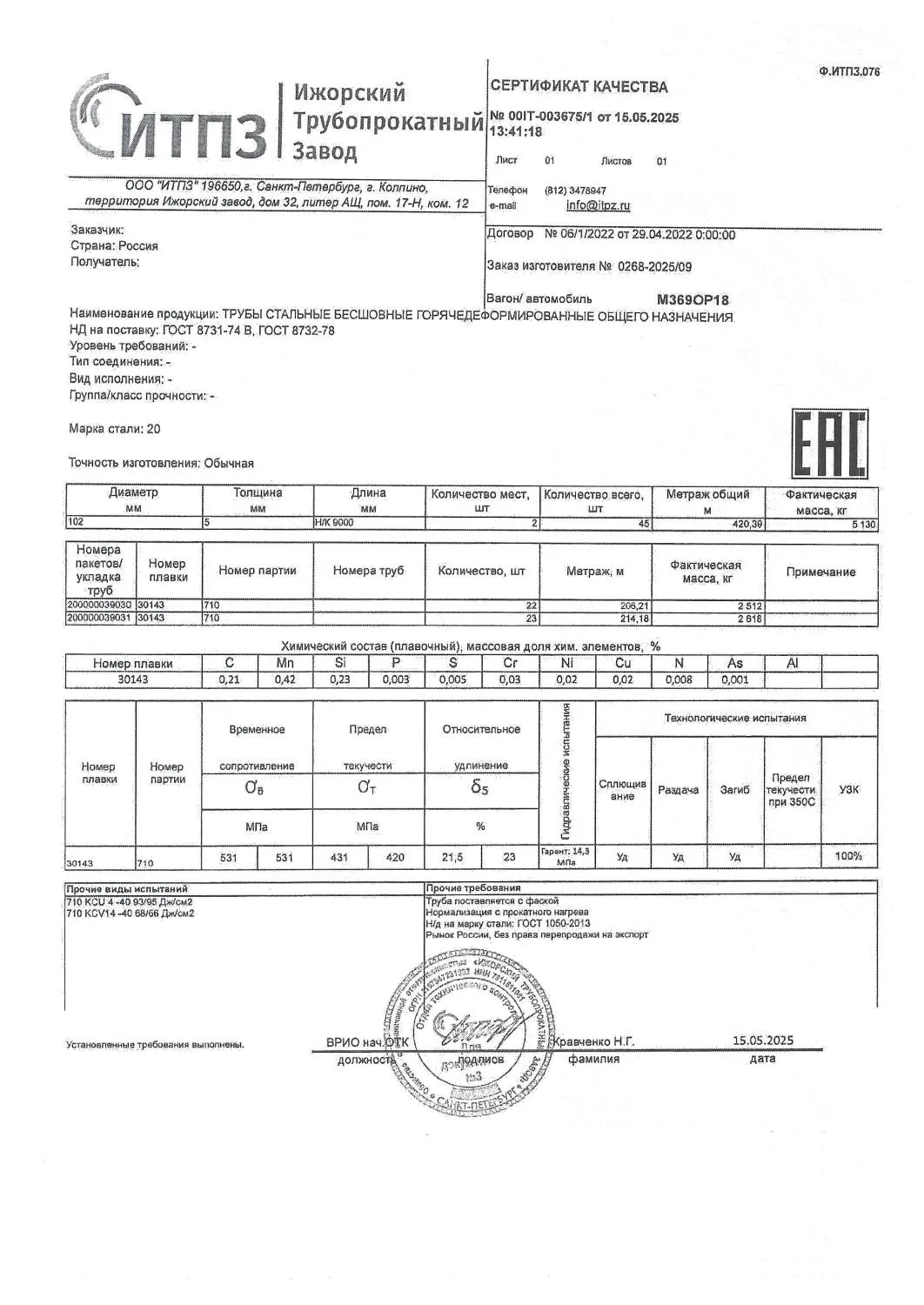 Сертификат качества для труб стальных бесшовных горячекатаных. Продукция по марки стали 20. Изделие соответствует ГОСТ 8731-74 В; ГОСТ 8732-78.
